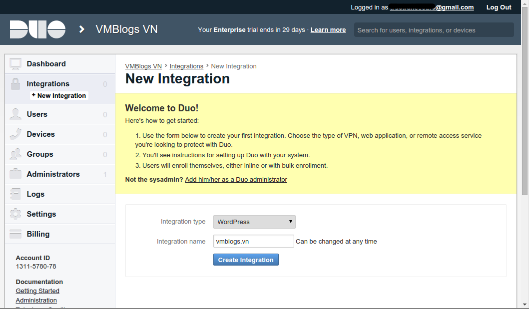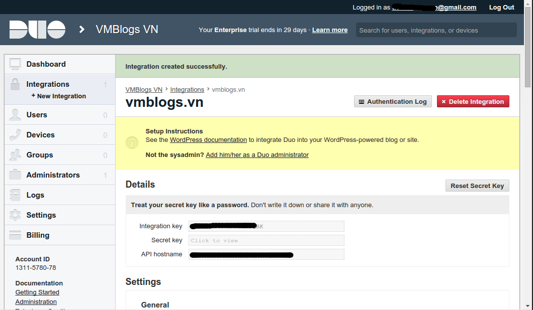 Nếu mọi thứ đều ổn thì bạn sẽ được chuyển đến giao diện thiết lập của Duo Security. Tại đây chúng ta sẽ tiến hành tạo key tích hợp cho WordPress.