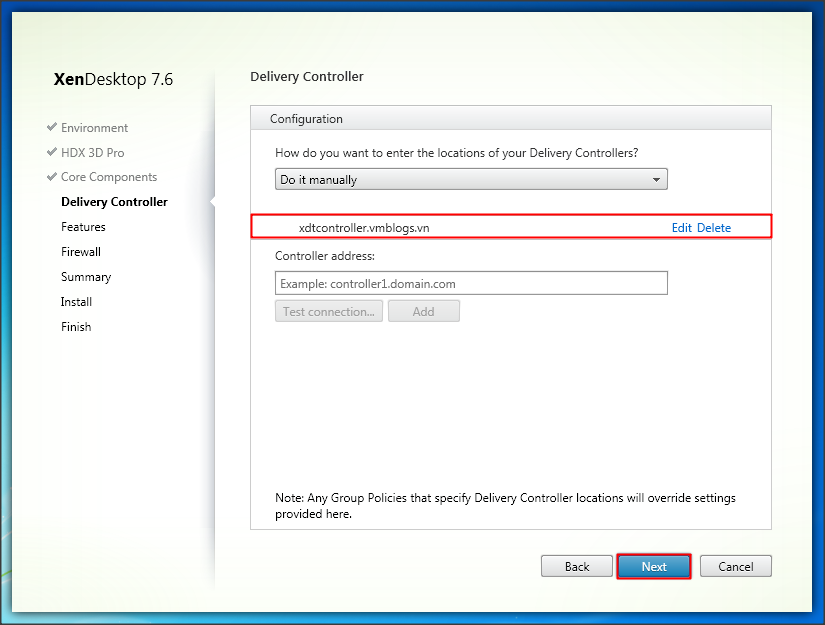 Cấu hình kết nối đến máy chủ Delivery Controller, có thể chọn Manually hoặc tìm kiếm trong danh sách Active Directory