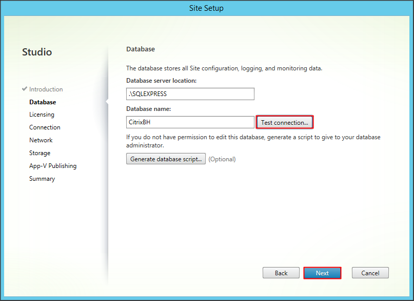 Ở phần trước chúng ta đã cài đặt SQL Server Express lên chính server này, chọn Test connection để kiểm tra kết nối với SQL Server. Lưu ý SQL là thành phần quan trọng quyết định sự thành công của LAB ảo hóa desktop