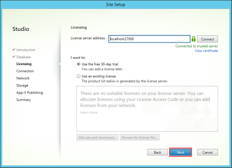 Tiếp tục với phần cấu hình Licensing. Ở đây kết nối đến máy Local do phần vừa rồi chúng ta đã cài đặt Citrix Licensing. Ở đây có thể chọn trial 30 ngày hoặc import tập tin license đã có
