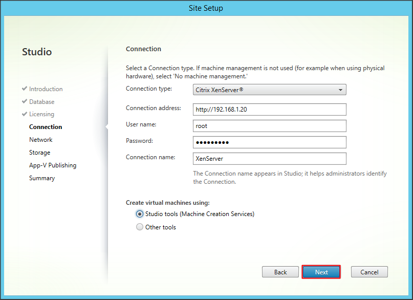 Phần connection, XenDesktop cho phép sử dụng rất nhiều giải pháp ảo hóa như Hyper-V với SCVMM, VMware vSphere, Citrix CloudPlatform, Amazon EC2…