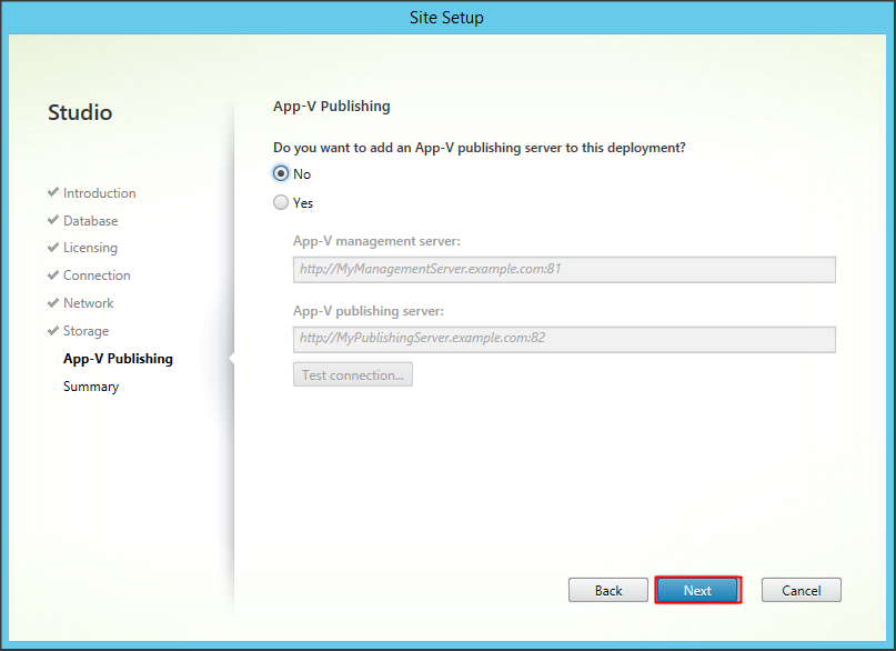 Tùy chọn tích hợp với Microsoft App-V. Trong bài LAB này mình không sử dụng App-V nên chọn No và Next để tiếp tục