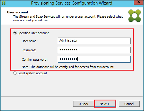 Lưu ý tài khoản này để khởi động dịch vụ Citrix SOAP, nếu chọn Local system account thì dịch vụ có thể không khởi động được.