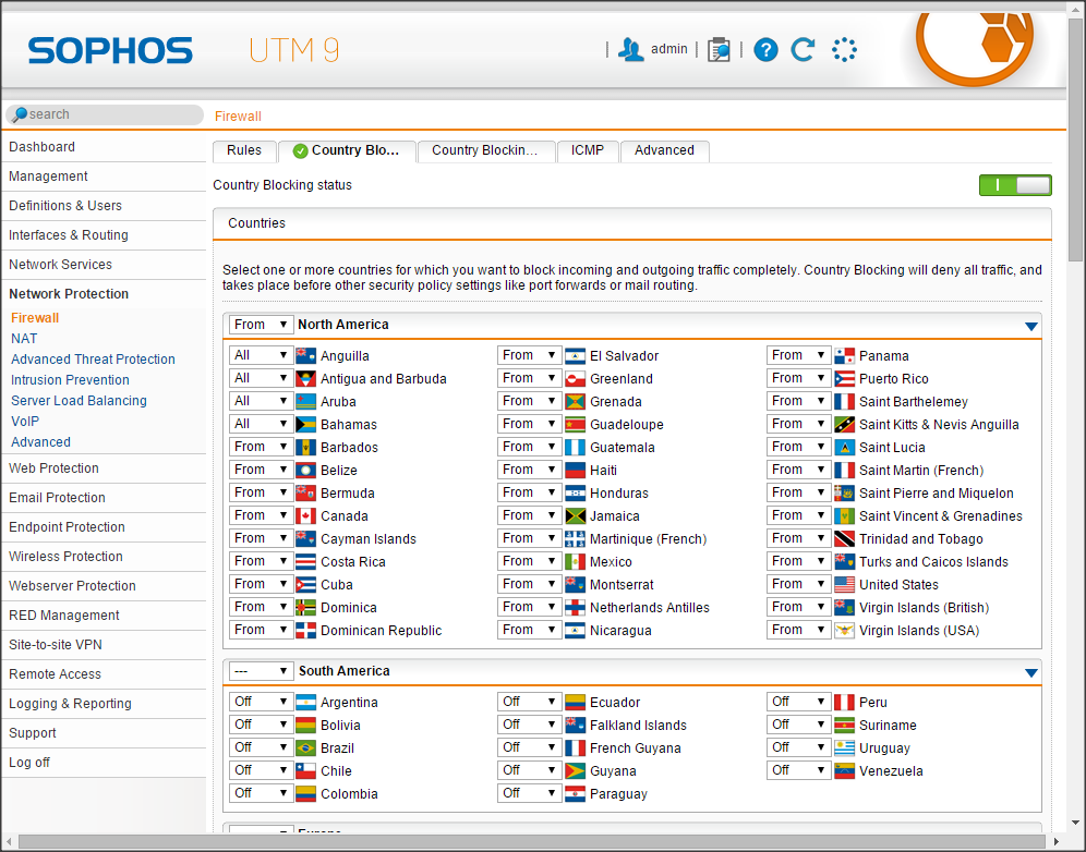 1-Sophos-UTM-Network-Protection-Firewall-5Country Blocking cho phép bạn bật, tắt dữ liệu kết nối đối với các quốc gia khác nhau.