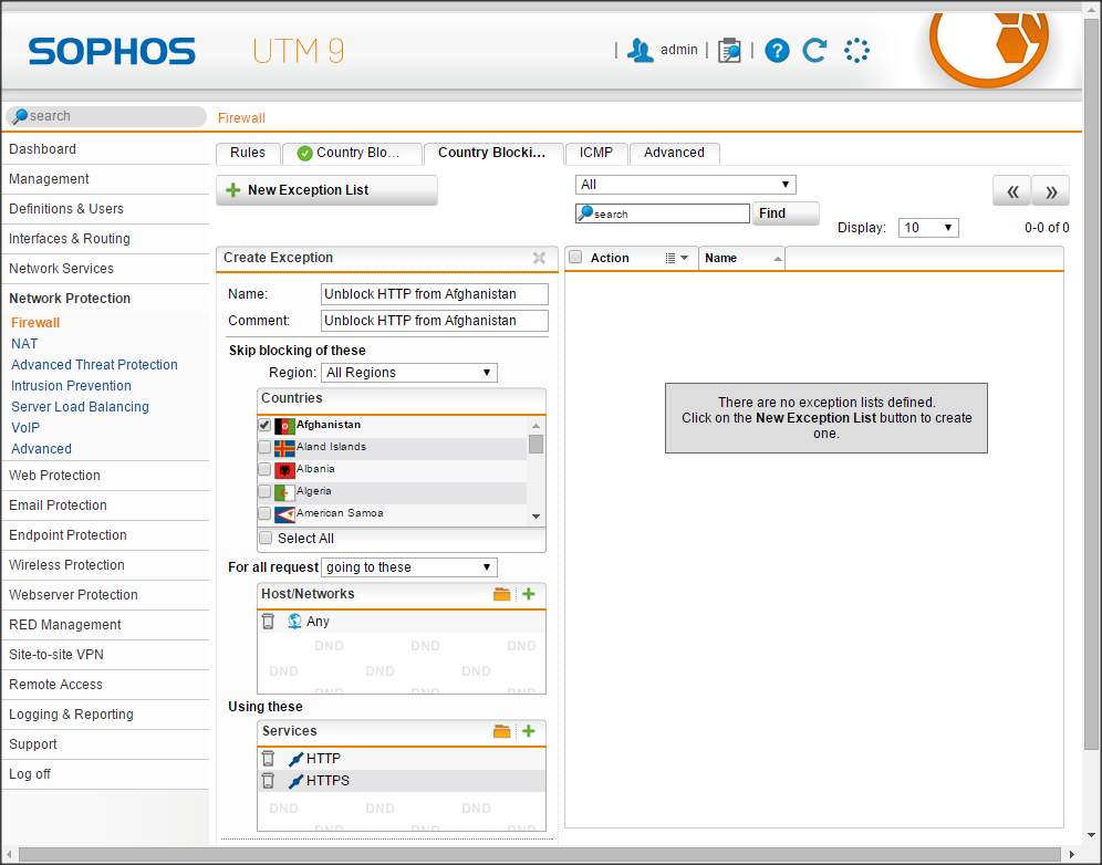 Mục Excẹption này cho phép tạo các quy tắc ngoại lệ. Ví dụ mình cho phép kết nối web (HTTP, HTTPs) kết nối đến Afghanistan.
