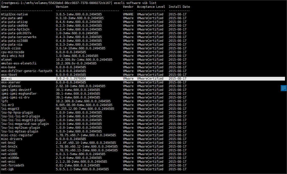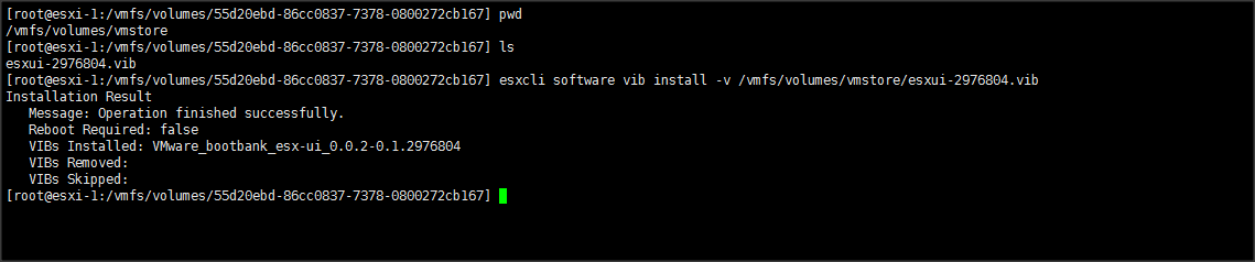 esxcli software vib install /vmfs/volumes/vmstore/esxui-2976804.vib